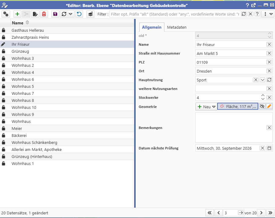 Der Geodateneditor ermöglicht das Erfassen vom Geo- und Sachdaten in einer von Ihnen frei definierten Tabellenstruktur. Basis ist eine zentrale Datenbanktabelle. Unterstützt werden dabei Spalten vom Typ Text, Zahl, Datum und Uhrzeit sowie Ja/Nein und natürlich auch Geometrien. Die Erfassungen von mehreren Geometrien pro Datensatz ist problemlos möglich.
