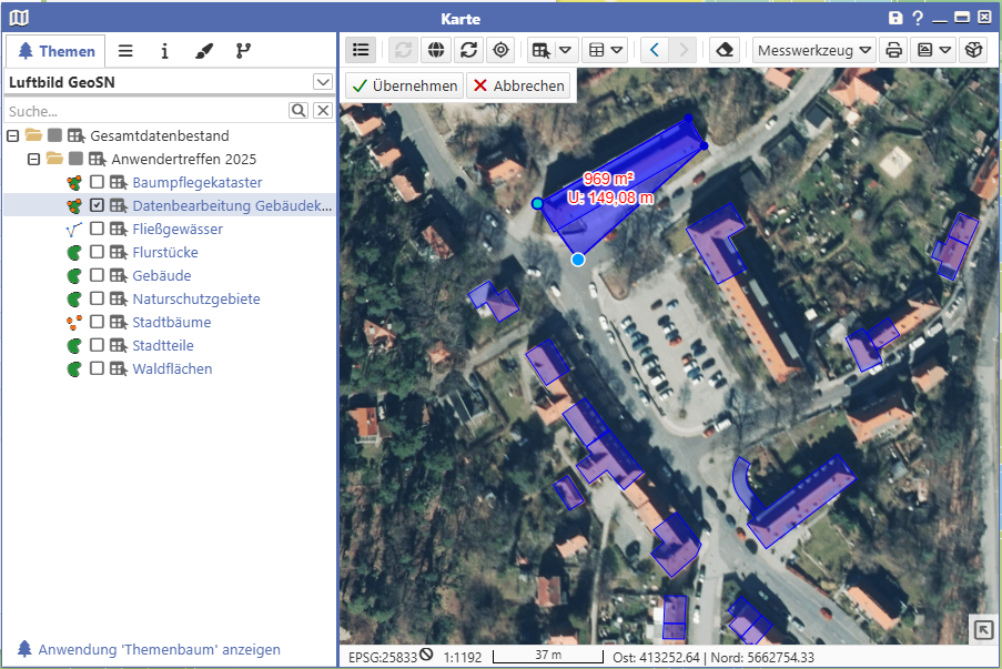 In der Karte können Sie Ihre Geometrie korrigieren oder neu erfassen, sowie weitere Themen aus dem Themenbaum anzeigen. Die Hintergrundkarten bieten ergänzende Informationen, bspw. aus dem Luftbild.