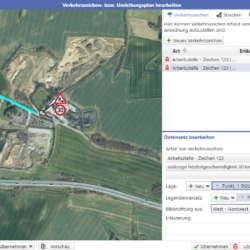 - Antragsbearbeitung mit der Möglichkeit, einfache Verkehrszeichen- und/ oder Umleitungspläne zu erstellen