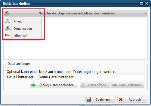 Privat: Nur die Person, die die Notiz erstellt hat, sieht diese, kann danach recherchieren und eine angehangene Datei herunterladen.
